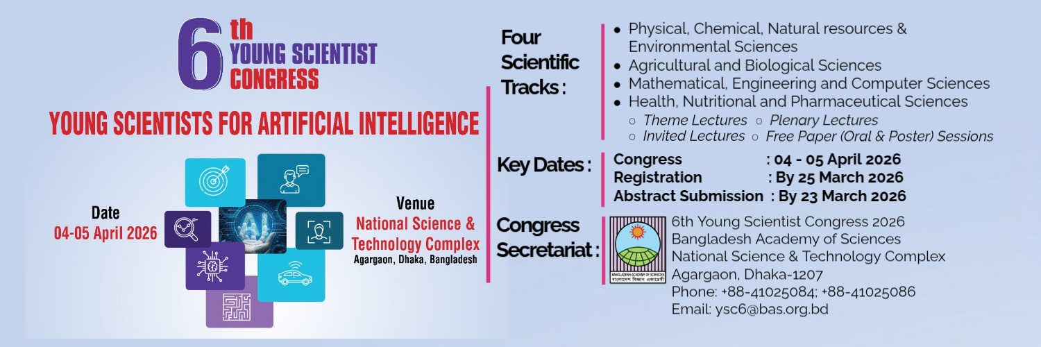 Bangladesh Is now enjoying a ‘demographic dividend’ with relatively high proportion of young people serving as the primary engine for the development of the country. It is now important to equip this young generation with frontline science, technology and innovation (STI) tools so that they can serve the society better at present and prepare themselves to face the challenges in future. Realizing the importance of attracting the best young minds to science, the Bangladesh Academy of Sciences (BAS) has initiated this series of Young Scientist Congress where the senior scientists and experts from home and abroad will share their knowledge and experience with the younger counterparts who are the main focus of the series. In addition to invited lectures, there will be opportunities for oral and poster presentations on relevant topics and it is expected that a large number of active researchers will be able to interact through these free paper sessions.